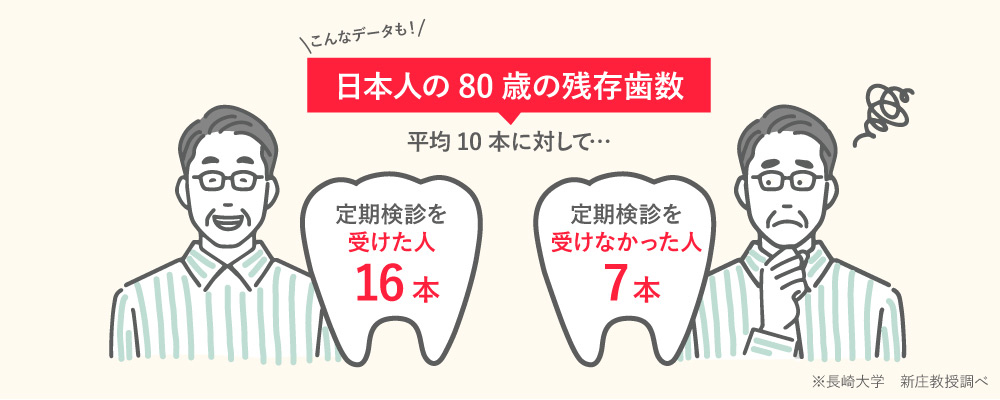 定期検診を受けた方と、痛くなるたびに治療だけを受けた人を比較した場合80歳になった時の残存歯の数が大きく変わります。
