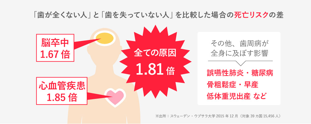 また、近年の研究で歯の本数が少ないほど死亡率が高くなる危険性があることも分かっています。お口の健康を守ることは、全身の健康維持に密接に関係しています。